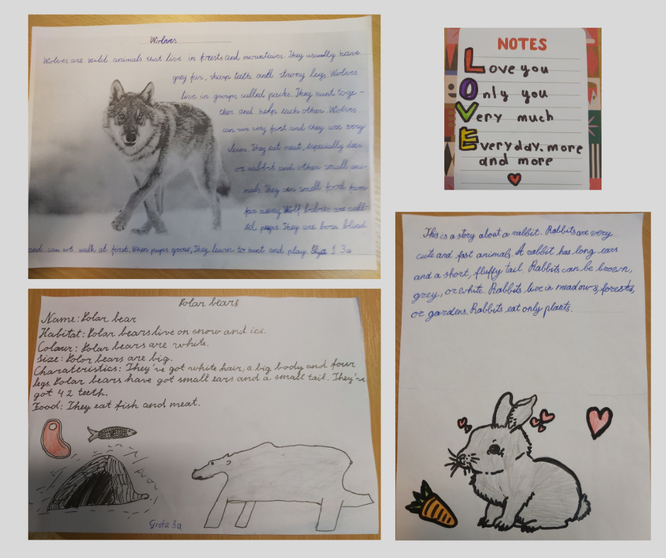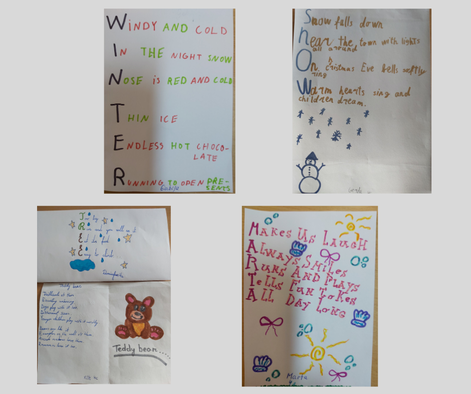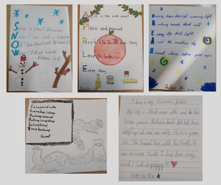 Mūsų mokykloje anglų kalbos mokiniai mokosi kūrybiškai. Akrostiniai eilėraščiai – tai smagūs eilėraščiai, kuriuose kiekvienos eilutės pirmosios raidės sudaro žodį ar frazę. Skaitant raides nuo viršaus žemyn – atrasite paslėptą žinutę. Tokį kūrybinį iššūkį drąsiai priėmė ketvirtokai ir parodė, kaip puikiai moka kurti, jausti kalbą ir žaisti su anglų kalbos žodžiais. Trečiokai ir antrokai taip pat nelieka nuošalyje – jie bendrauja, kuria ir mokosi, atlikdami įdomius projektinius darbus bei naudodami skaitmenines technologijas. Anglų kalbos mokytoja Stasė kviečia pasigrožėti vaikų sukurtais darbais (nuotraukų galerija žemiau).
