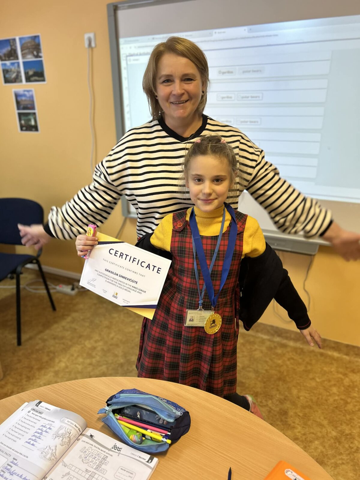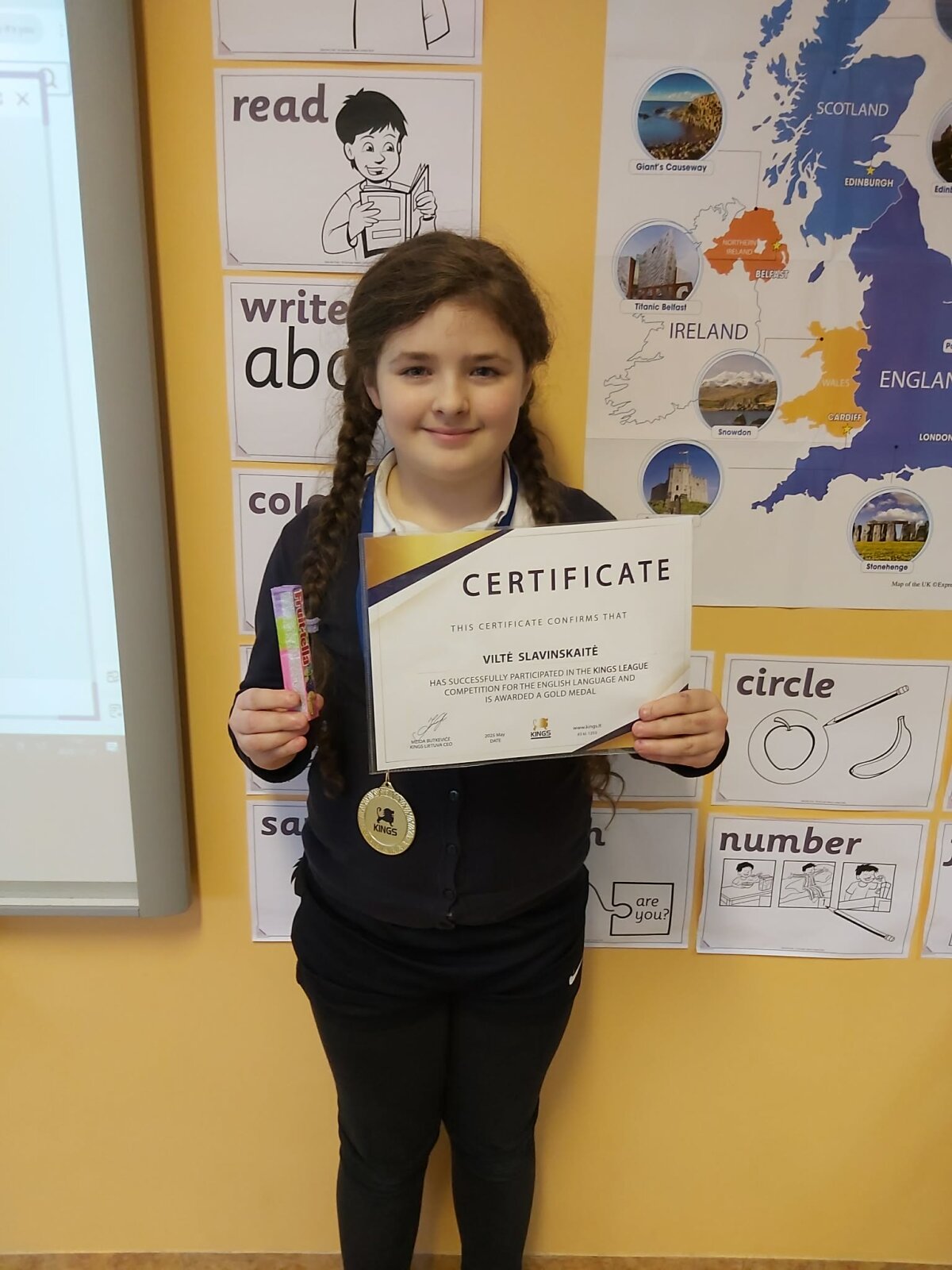 Mokiniai taip pat mėgsta dalyvauti įvairiuose konkursuose, kuriuose gali pasitikrinti savo žinias. 3B klasės mokinė Grasilda ir 4C klasės mokinė Viltė puikiai pasirodė anglų kalbos KINGS konkurse. Mergaitės sėkmingai įveikė visas kvalifikacinio turo, finalo, lygos užduotis ir buvo apdovanotos auksiniais medaliais. Sveikiname!
