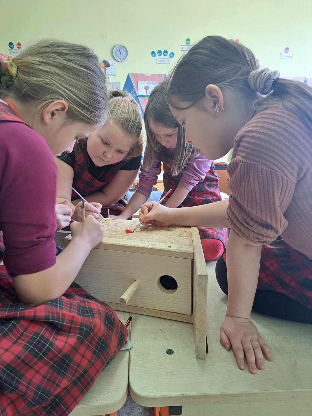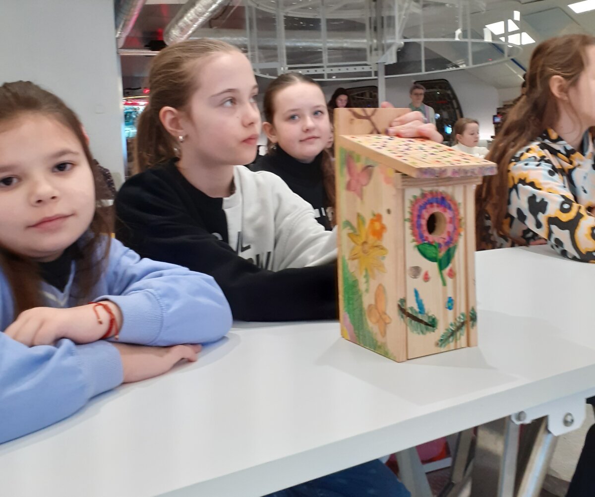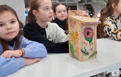 3A, 3C, 4C ir 4D klasių mokiniai klasėse puošė inkilus ruošdamiesi renginiui. Ant jų pražydo gėlės, nušvito saulė ir giedras pavasario dangus. Žalias stogas padės prisitaikyti prie medžių ir būti nepastebimam plėšrūnams.