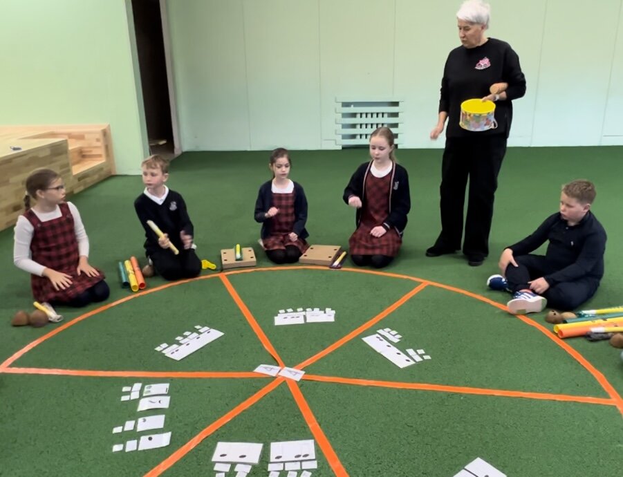 Mokytoja pasakoja, kad lauko muzikos instrumentais mokiniai improvizavo ir kūrė ritminius derinius rondo muzikos forma, atsirinko idėjas muzikiniam sumanymui įgyvendinti. Grupėje sukomponavo nesudėtingą kūrinį su aiškia pradžia ir pabaiga, jį užfiksavo įprastine ar simboline notacija. Improvizavo muzikinius darinius pagal sąlygą ( metrą). Pasirinko priemones nuotaikai sukurti.