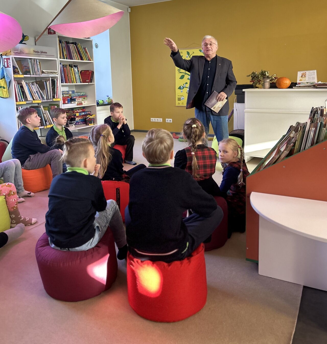 Jaukioje bibliotekos aplinkoje antrokai klausėsi rašytojo knygelės „Žiūroniuko nuotykiai“ smalsaus berniuko, vardu Jonas, kuris mėgo tyrinėti dangų, žvaigždes ir dangaus kūnus savo gamybos žiūronais, patirtų nuotykių.