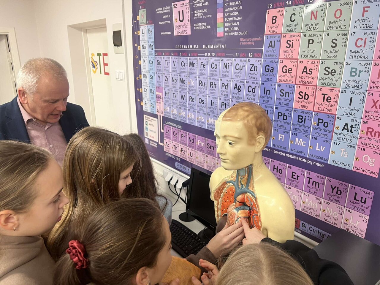 Gamtos mokslų laboratoriją mokiniams pristatė ir pamokoje dalyvavo progimnazijos direktorius Kazimieras Karalius.