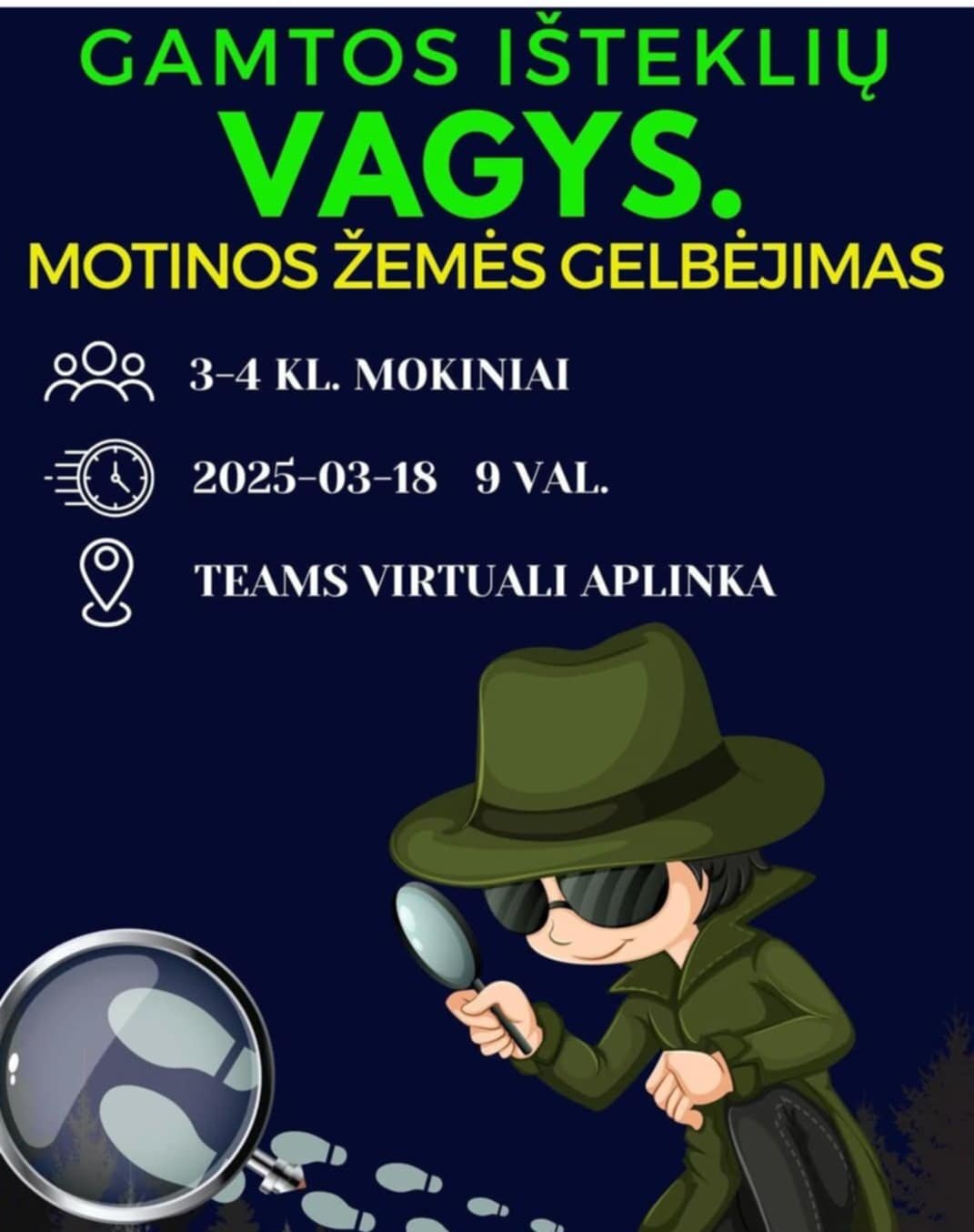 Kovo 18 mūsų mokyklos 4a (mokytoja Dovilė) ir 4d (mokytoja Indrė) klasių mokiniai dalyvavo nuotolinėje pamokoje – detektyve ,,Gamtos išteklių vagys”, kitaip sakant, šių klasių mokiniams teko sudalyvauti labai svarbioje Žemės gelbėjimo misijoje.