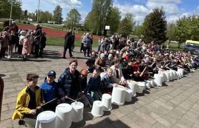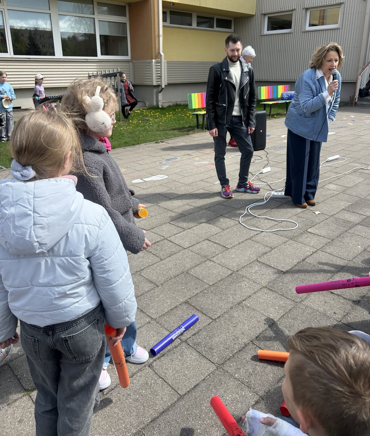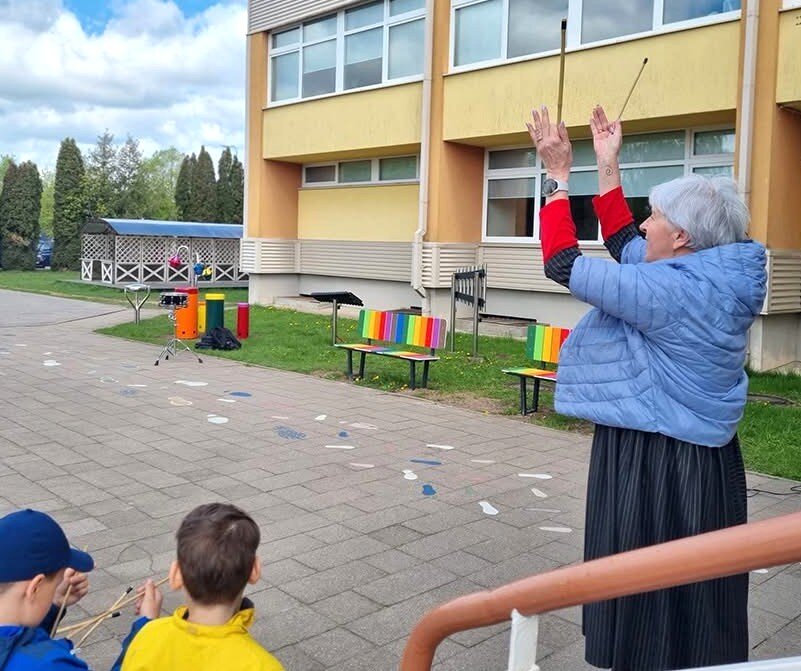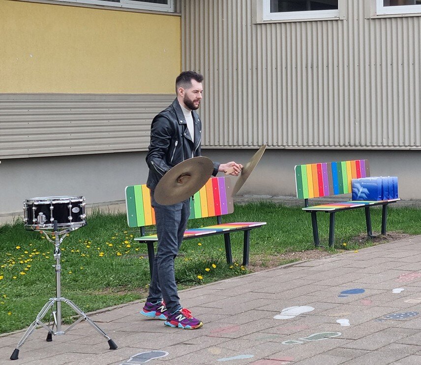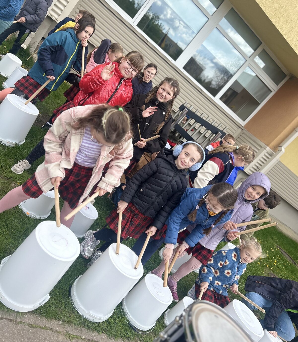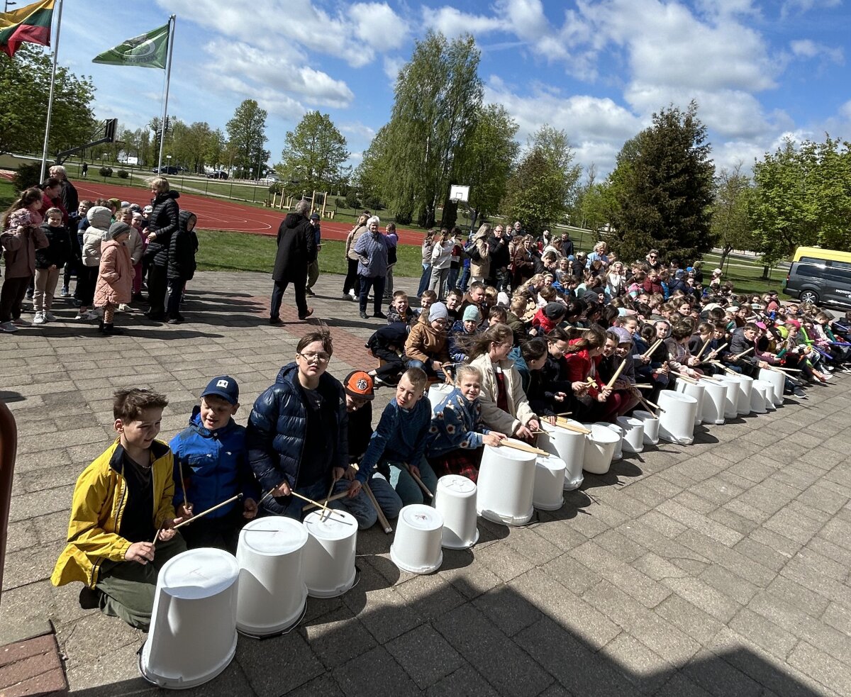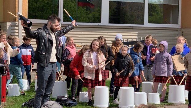 Svarbiausias mokytojas Lukas ne tik meistriškai muzikavo ir pasakojo vaikams apie atsivežtus perkusijos instrumentus, puikiai valdė gausiai susirinkusią auditoriją, bet ir čia pat ekspromtu subūrė vaikų su atsineštais instrumentais grupę ir organizavo kūrybines dirbtuves. Į darnų skambesį buvo įjungti ir mokyklos kieme esantys lauko muzikos instrumentai.