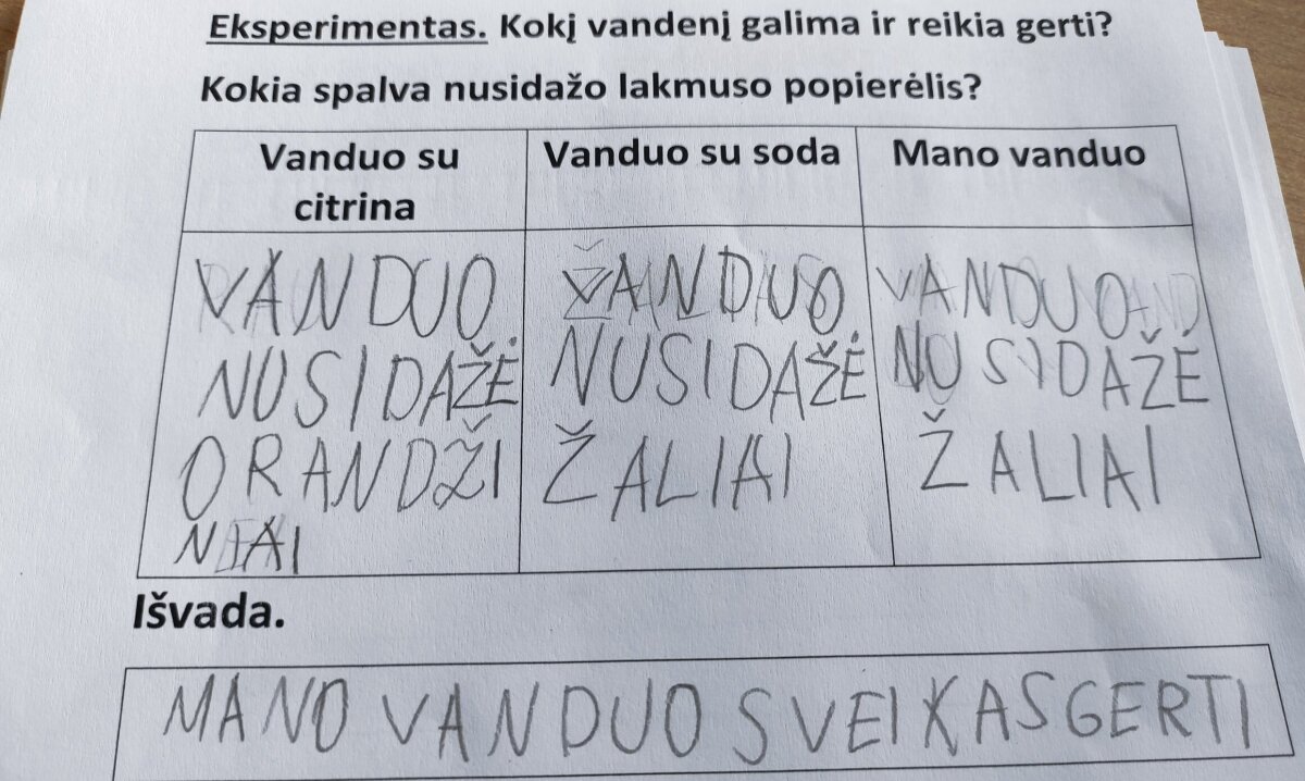 Mokiniams pirmiausia teko prisiminti ir išsiaiškinti kai kuriuos klausimus: Kam reikalingas vanduo? Kokia jo cheminė formulė? Kiek jo Žemėje yra? Kodėl žmonės nuo seno kūrėsi prie vandens, kam jį naudojo? Kodėl jį reikia taupyti? Kur dingsta panaudotas vanduo? Prieš pasinerdami į bandymų ir tyrinėjimų veiklas, mokiniai sužinojo labai daug naudingos ir įdomios informacijos: kodėl žemė vadinama Mėlynąja planeta, kodėl reikia tausoti vandenį, kiek vandens reikia išgerti per dieną, kokios ištinka katastrofos teršiant vandenį.