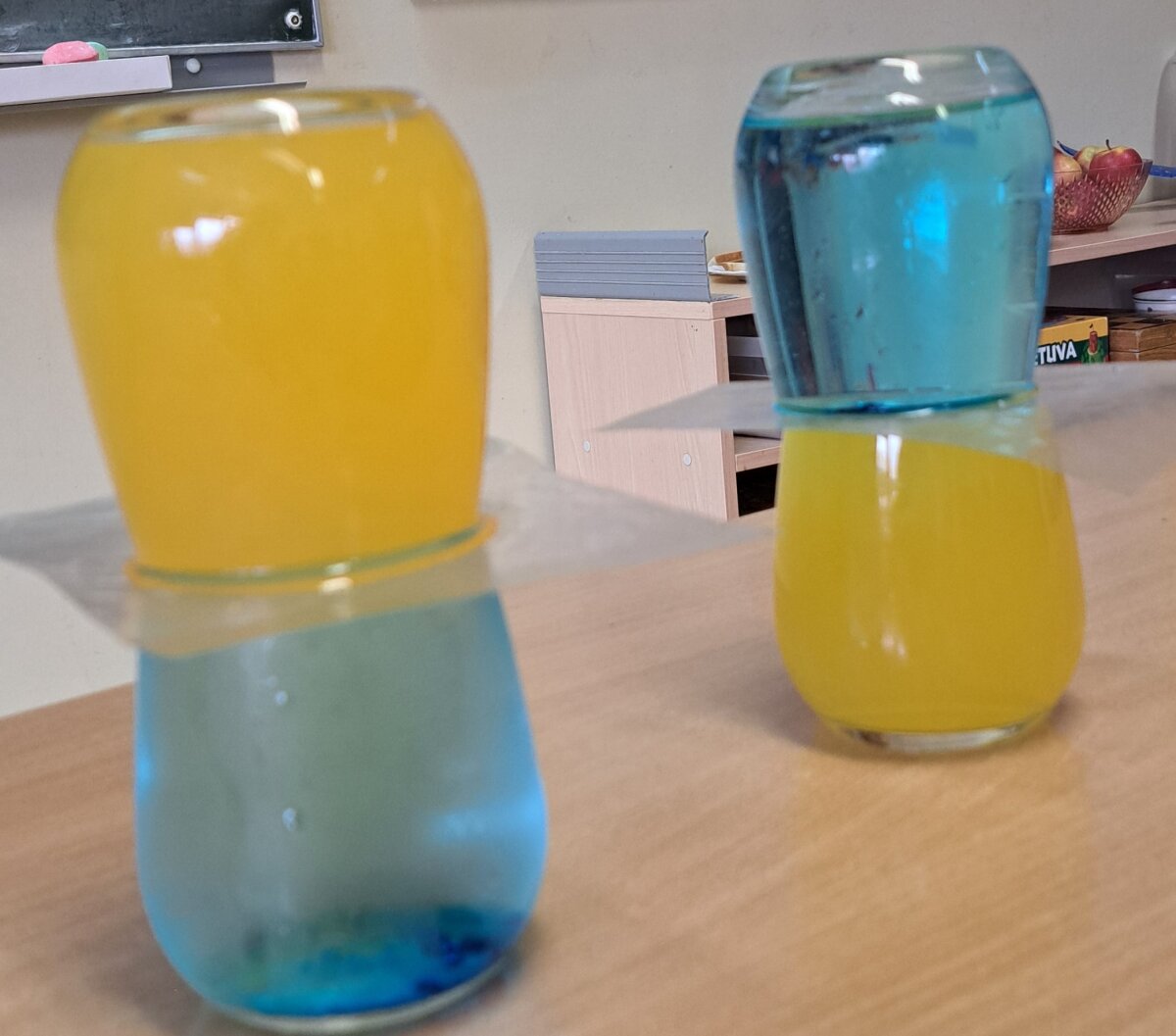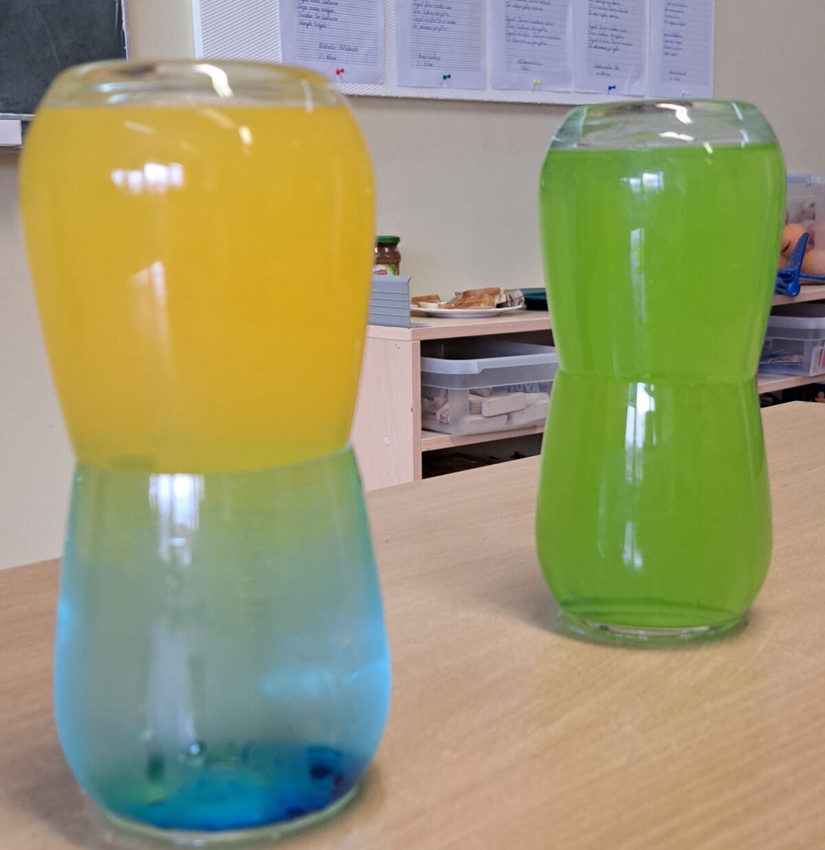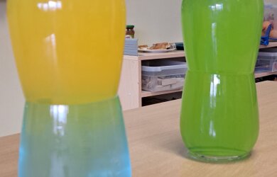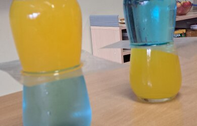 Dar kiti antrokai atliko du spalvotus bandymus su vandeniu. Jų dėka įsitikino, kad šaltas vanduo yra sunkesnis, todėl jo įpylus į karštą vandenį akimirksniu susimaišo ir pakeičia spalvą. Tuo tarpu karštas vanduo lieka plūduriuoti viršuje.