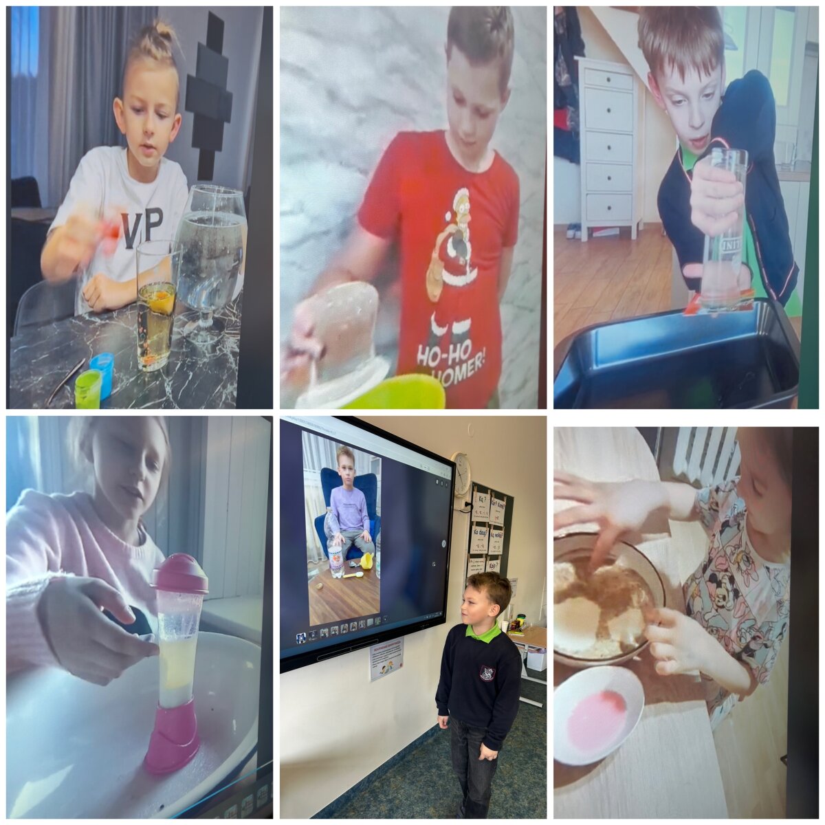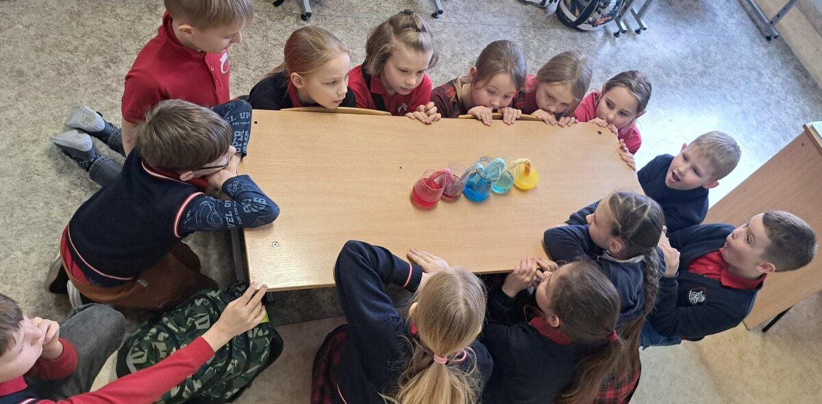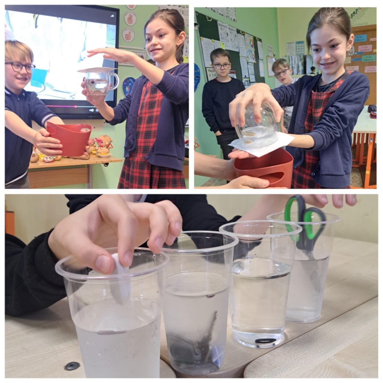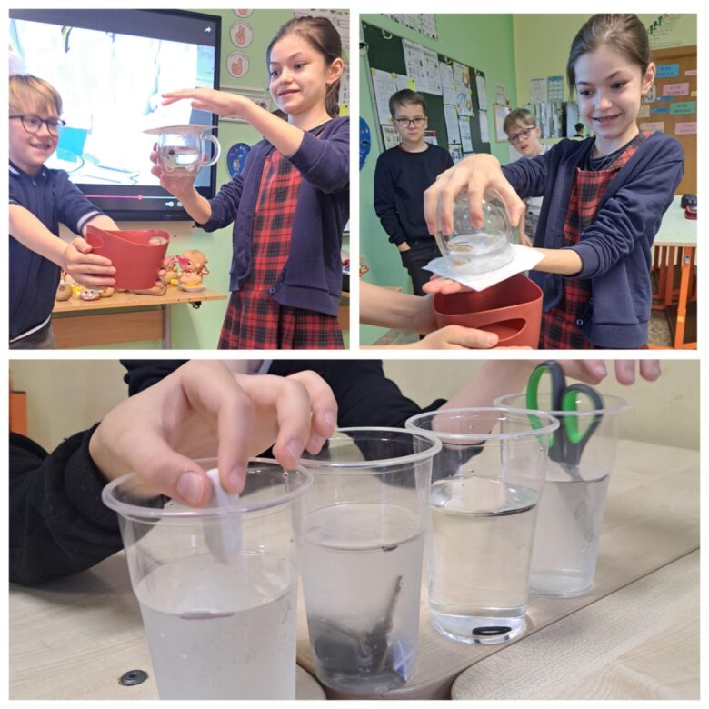 Mikroskopo pagalba stebėjo, kaip atrodo vandentiekio vandens, limonado, mineralinio vandens bei upės vandens lašeliai. Kai vandeniu užpylėme kisielių, puodelis buvo pilnas, bet po 10 minučių nuslūgo. Gilinosi, kodėl taip atsitiko. Tikrino, kurie daiktai plaukia, o kiti skęsta, pustuštė dantų pastos tūtelė ir plaukė, ir skendo.