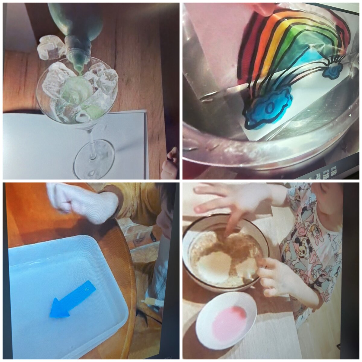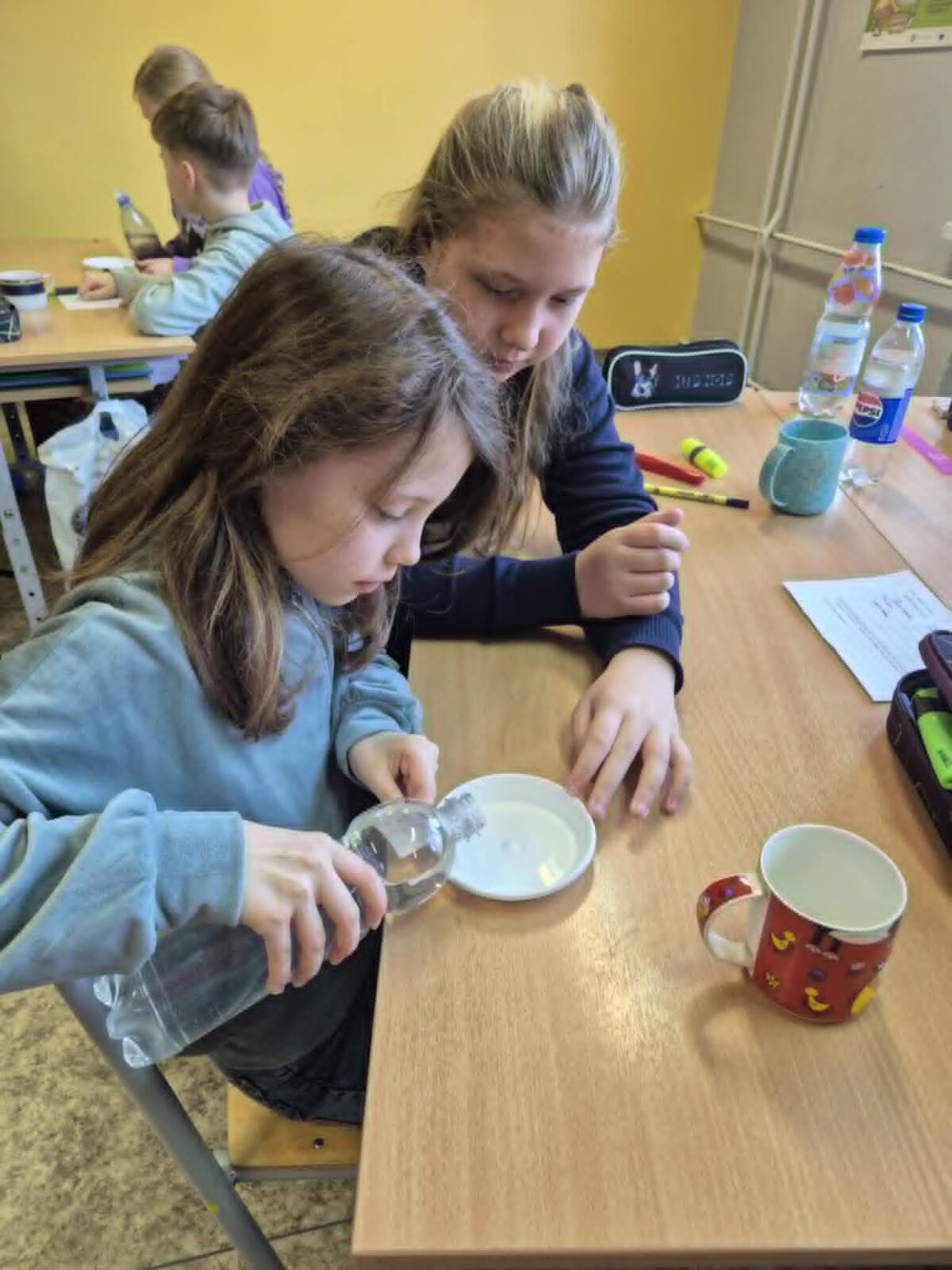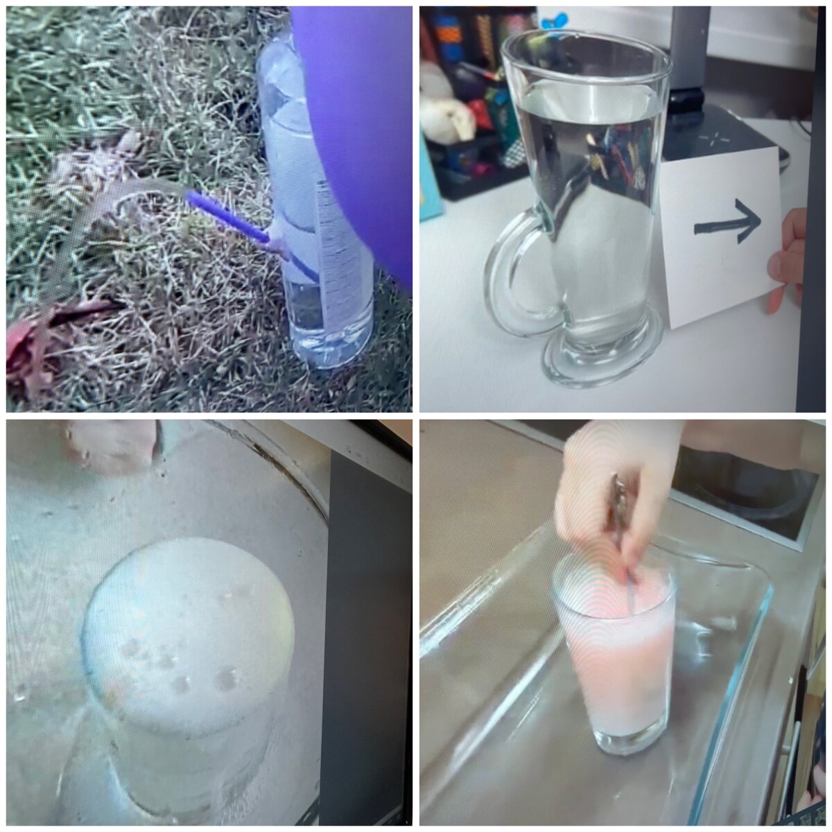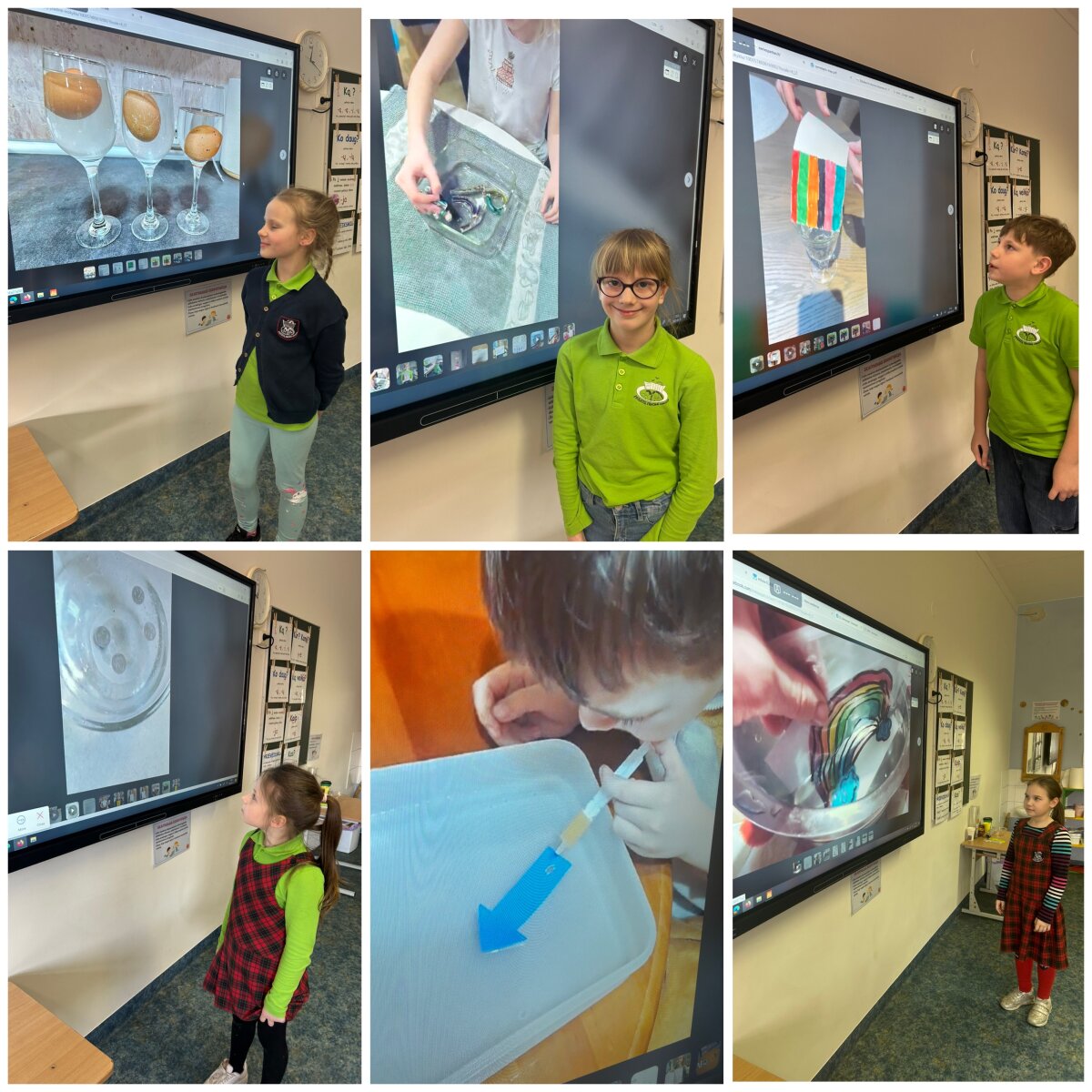 Mikroskopo pagalba stebėjo, kaip atrodo vandentiekio vandens, limonado, mineralinio vandens bei upės vandens lašeliai. Kai vandeniu užpylėme kisielių, puodelis buvo pilnas, bet po 10 minučių nuslūgo. Gilinosi, kodėl taip atsitiko. Tikrino, kurie daiktai plaukia, o kiti skęsta, pustuštė dantų pastos tūtelė ir plaukė, ir skendo.