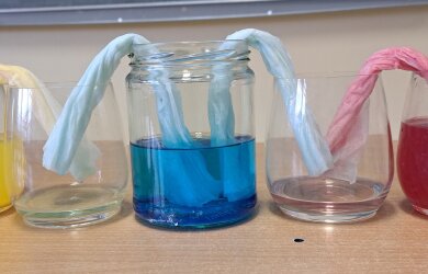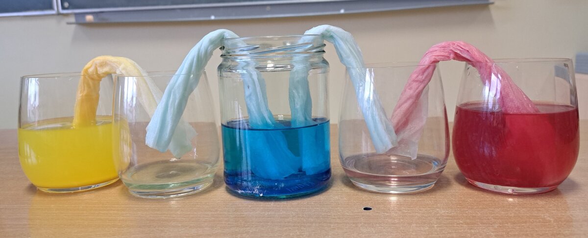 Kito bandymo metu mokiniai stebėjo, kaip per susuktą popierinę servetėlę skystis persigeria ir laša į tuščią stiklinę. Iš skirtingų spalvų skysčių susidarė naujos spalvos.