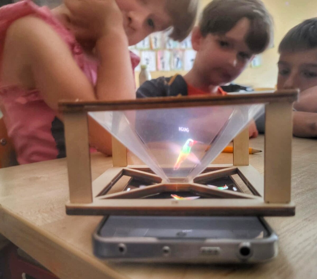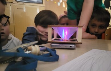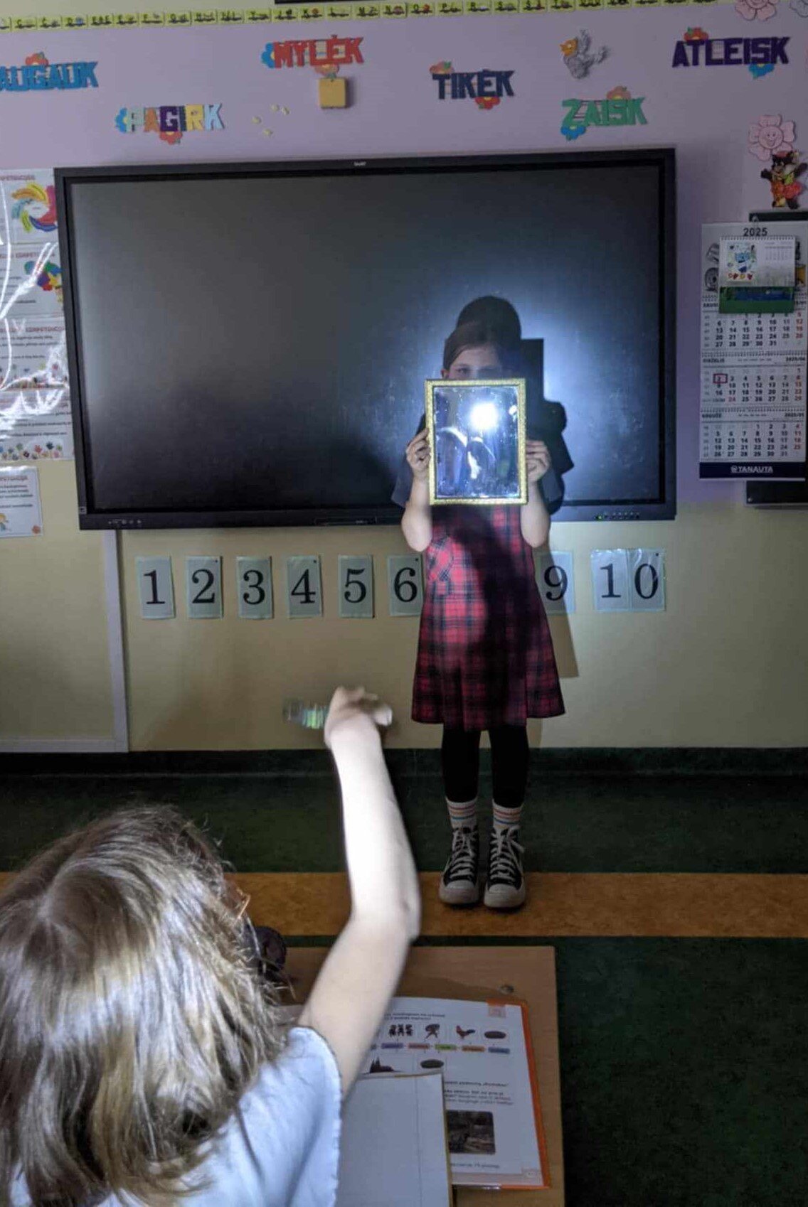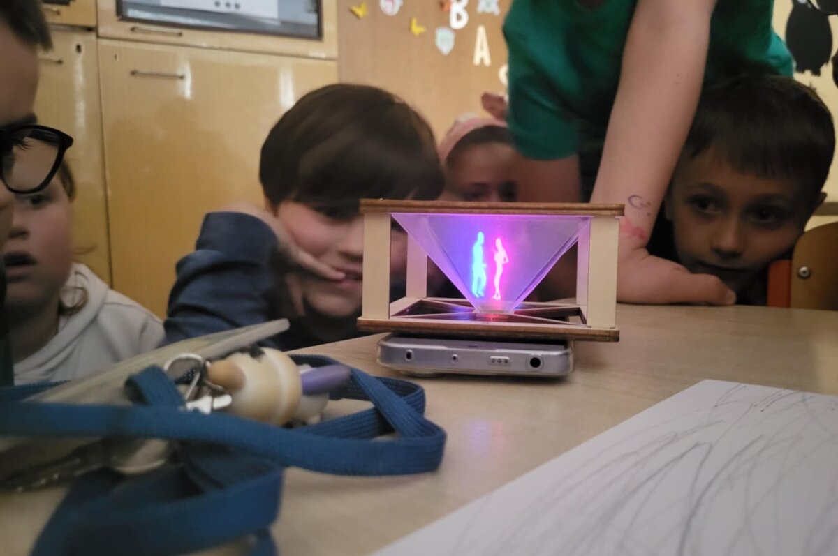 Mokytoja Ieva pademonstravo hologramos veikimo principą. Pirmokai ne tik susipažino su holograma, bet ir aiškinosi, iš kur ir kaip šviesa atsiranda, kaip ji atsispindi, koks jos greitis, kuo ji svarbi pasauliui. Atliko įvairias užduotis su šešėliais, tyrinėjo įvairiaspalves švieseles, veidrodžiu gaudė “saulės zuikučius”.