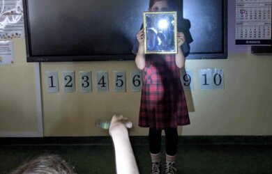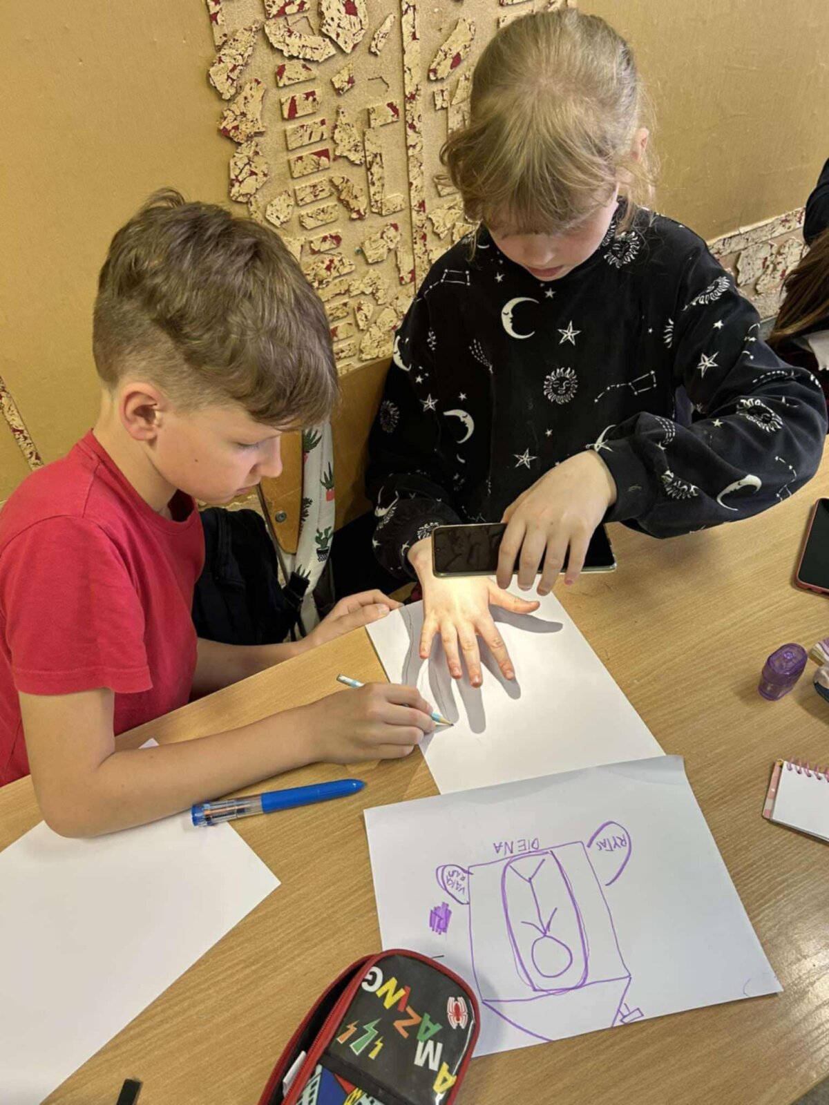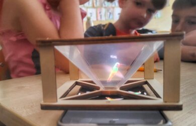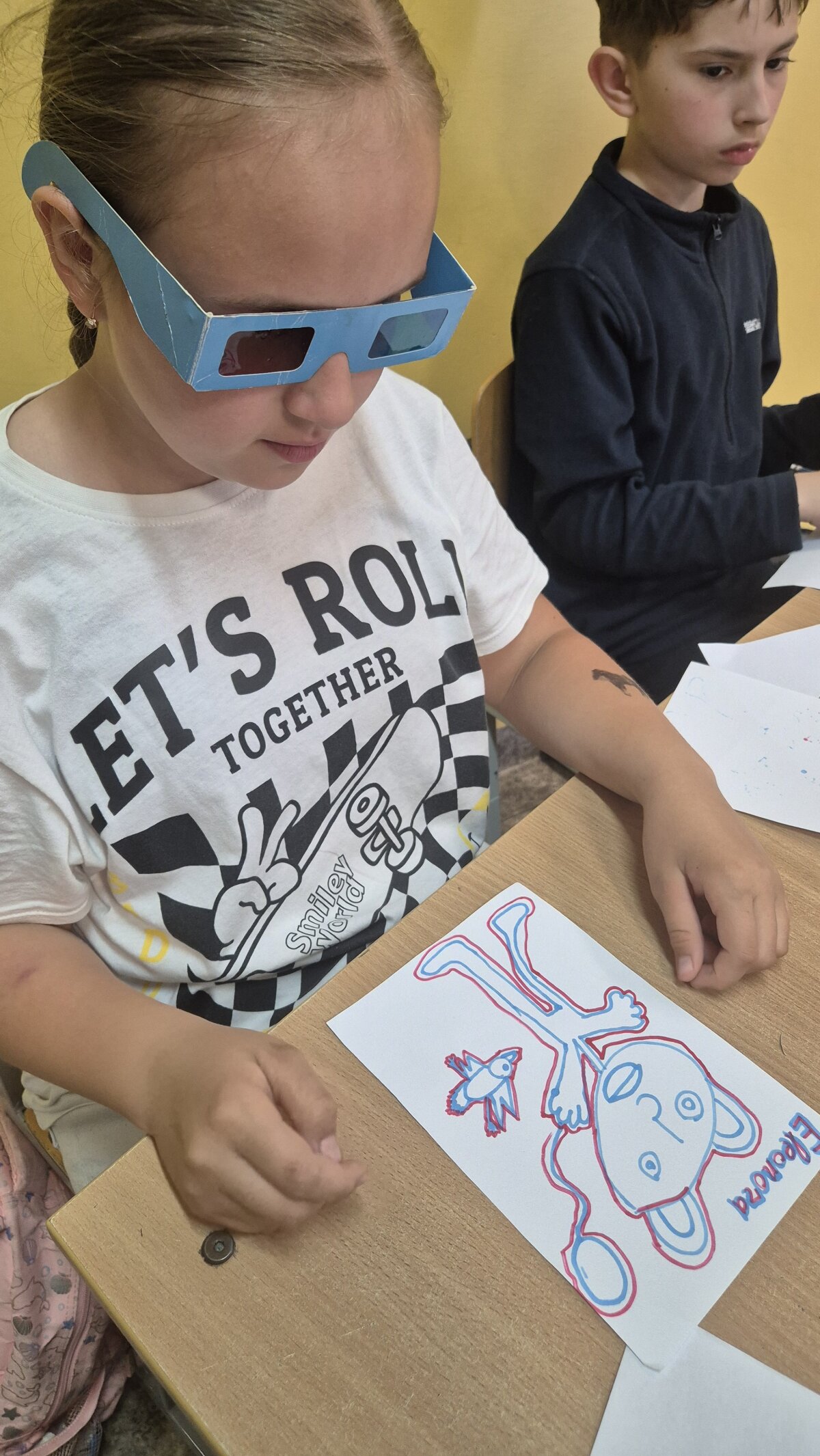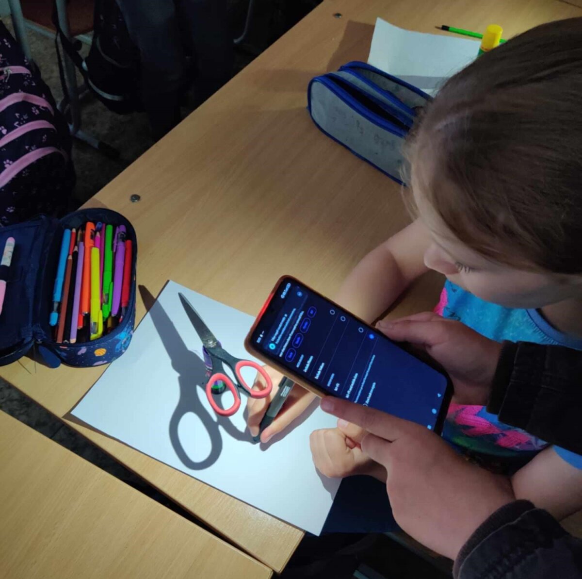 Mokytoja Ieva pademonstravo hologramos veikimo principą. Pirmokai ne tik susipažino su holograma, bet ir aiškinosi, iš kur ir kaip šviesa atsiranda, kaip ji atsispindi, koks jos greitis, kuo ji svarbi pasauliui. Atliko įvairias užduotis su šešėliais, tyrinėjo įvairiaspalves švieseles, veidrodžiu gaudė “saulės zuikučius”.