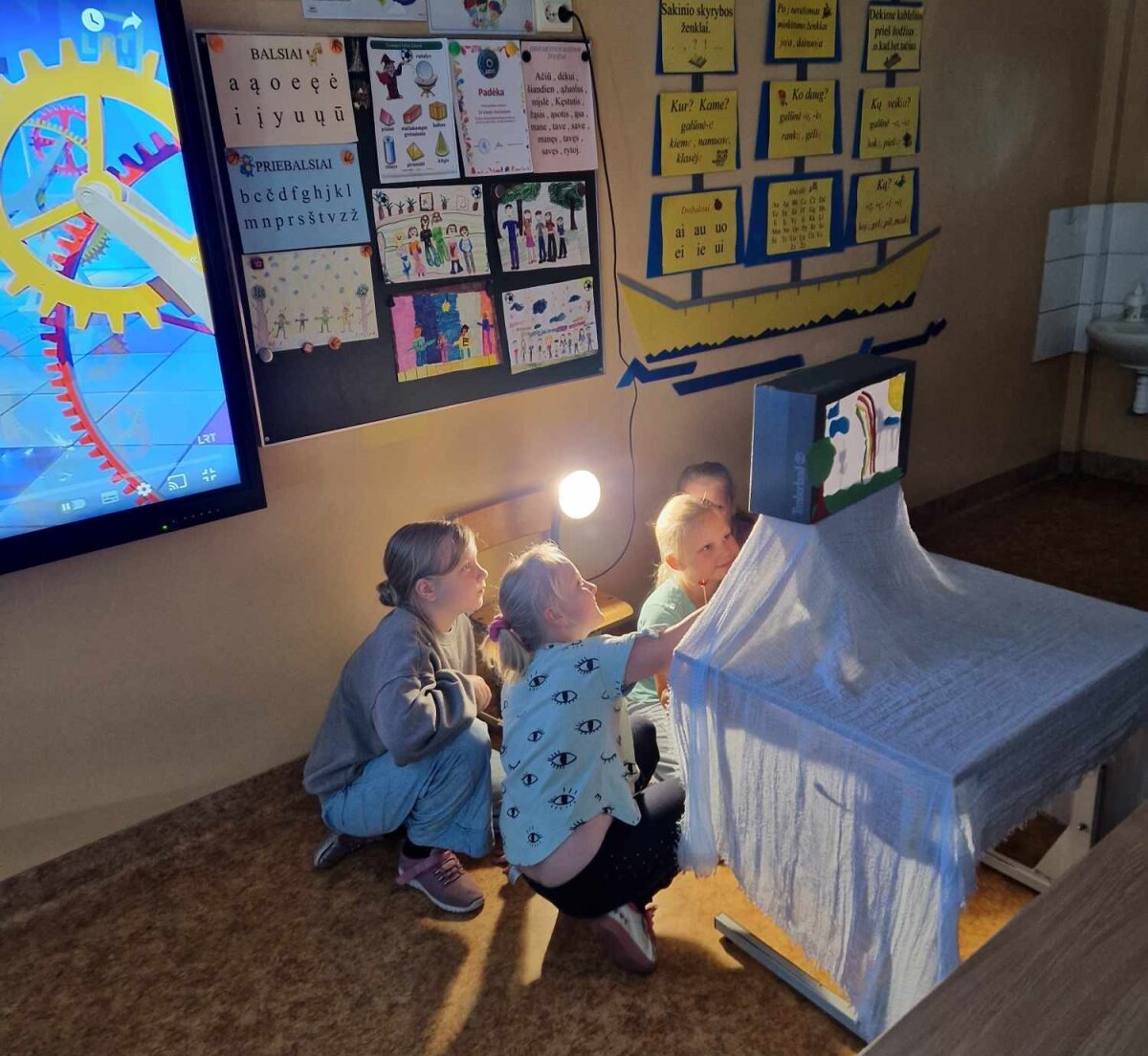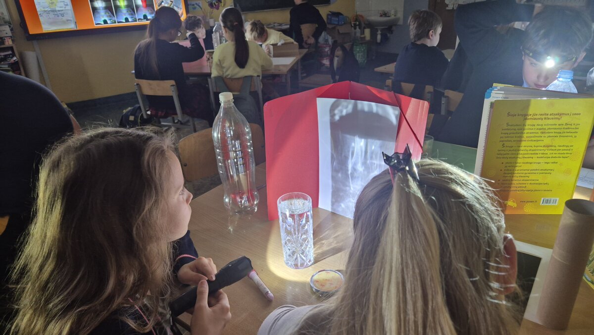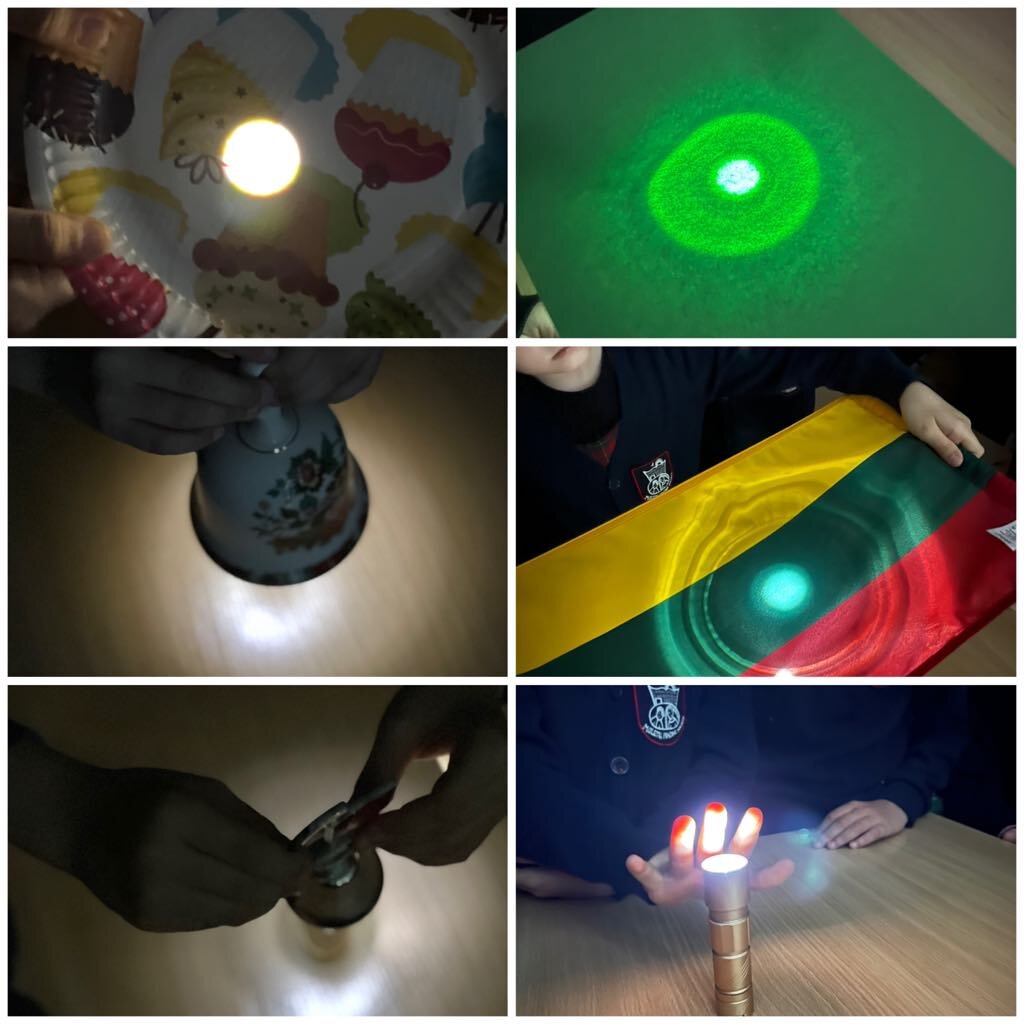 Vaikai eksperimentavo su šviesą atspindinčiomis ir sugeriančiomis medžiagomis, tyrinėjo šešėlius ir patys kūrė šešėlių teatrą. Naudodami spalvotus filtrus aiškinosi, kaip maišosi šviesos spalvos, o iš skaidrios plėvelės ir žibintuvėlio sukūrė paprasčiausią projektorių ir stebėjo, kaip jų piešiniai atgyja ant sienos. Didžiausią įspūdį antrokams paliko stebėjimas, kaip šviesa lūžta vandenyje – liniuotė staiga pasirodė sulūžusi, netgi pasikeitė rodyklės kryptis.