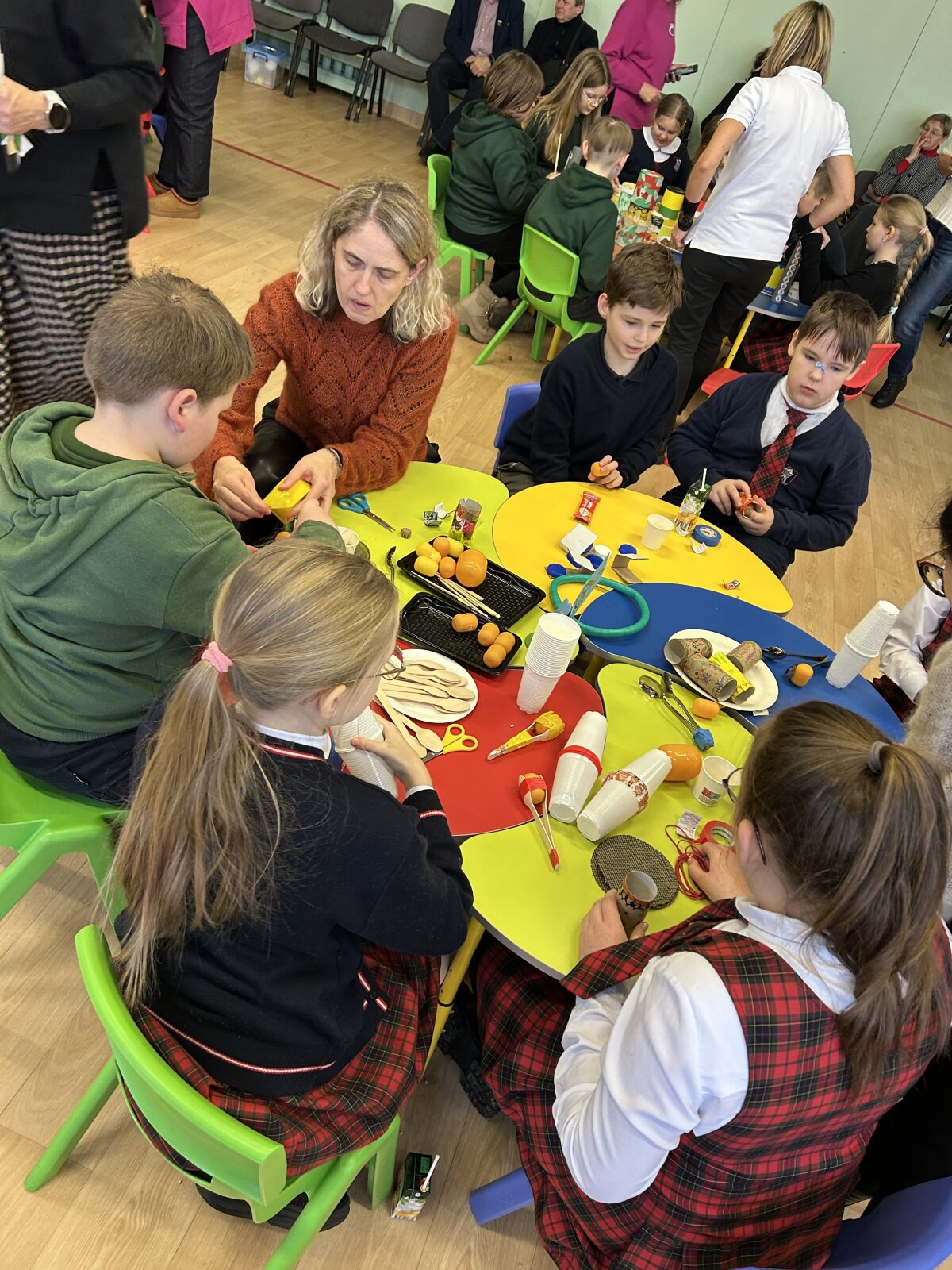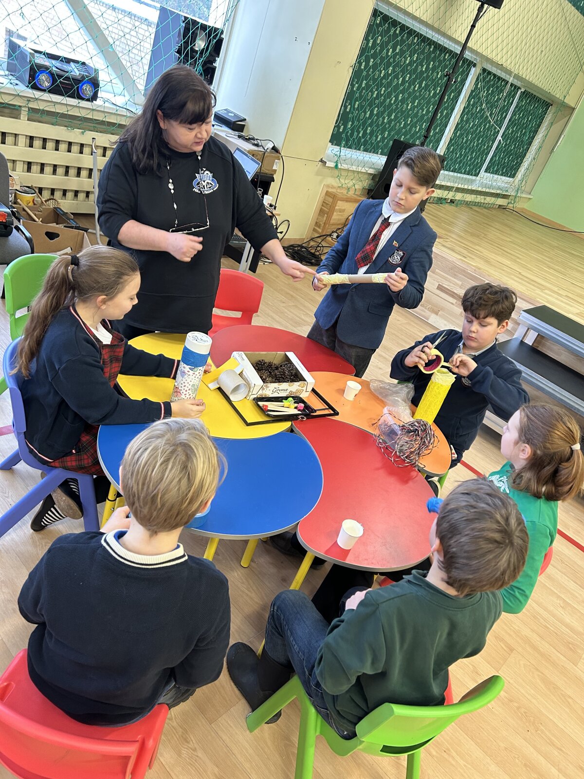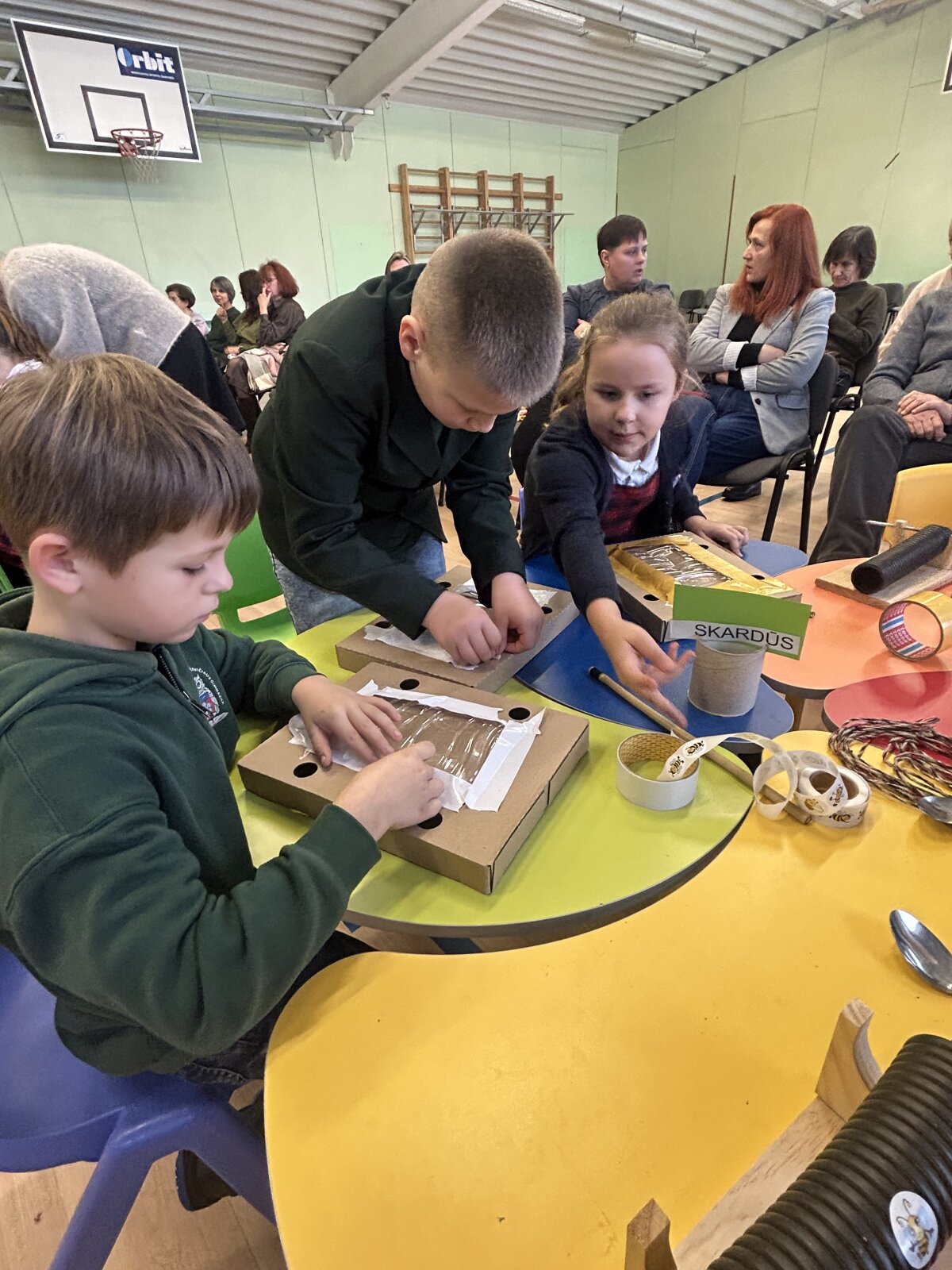 Susirinkę į antrą dalį, po priešpiečių pertraukos, gilinosi į garsus muzikoje, kokie jie būna, kaip dera, iš paprastų mūsų buityje atliekančių ir gamtinių medžiagų gamino muzikos instrumentus, juos išbandė ir kartu muzikavo. Mokiniams padėjo ir konsultavo mokytojos Rasa Vizbarienė, Eugenija Bužinskienė, Vita Kaušinienė, Edita Kasinskaitė, Ieva Šeškauskienė ir Indrė Karaliūtė. Bendram visų dalyvių orkestrui, grojusiam vaikų pagamintais muzikos instrumentais, ir dainavimui dirigavo mokytoja Vita.