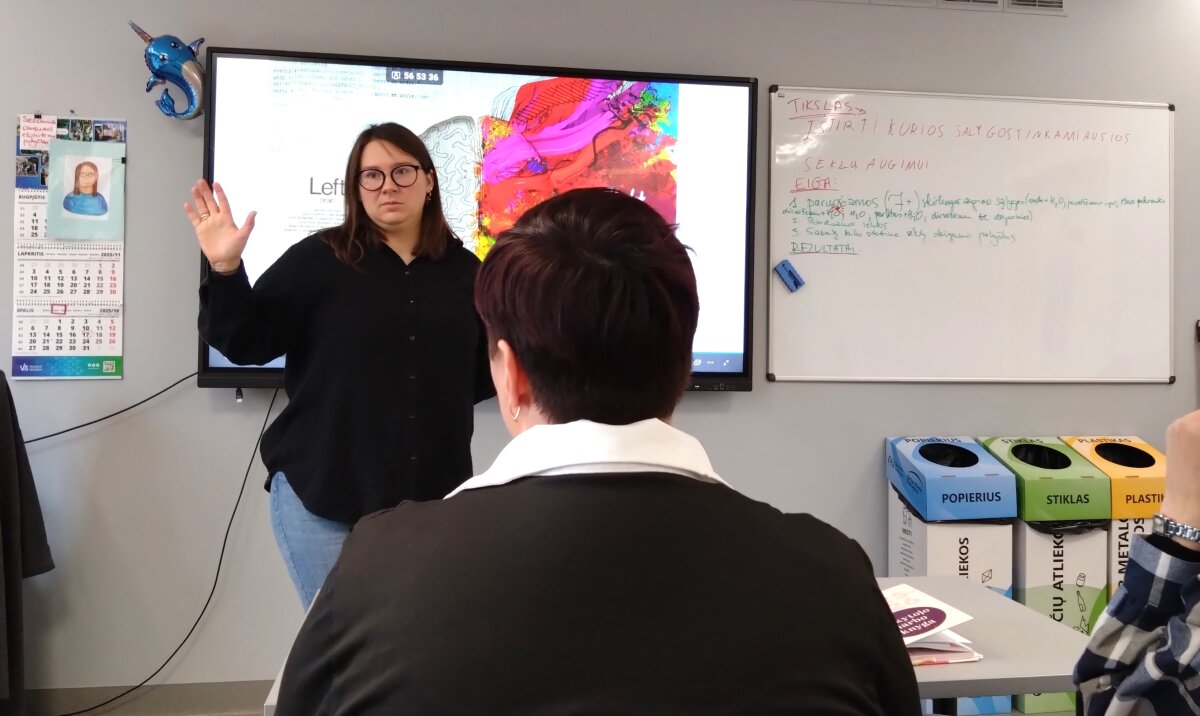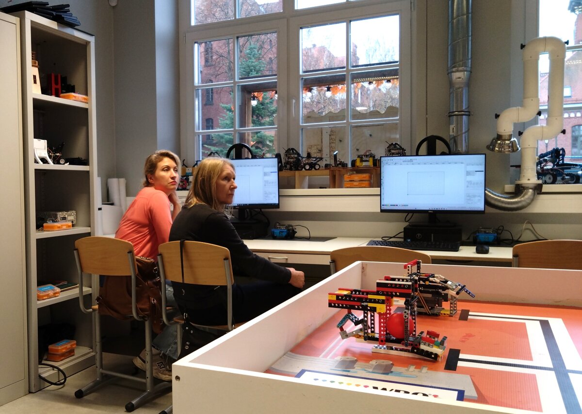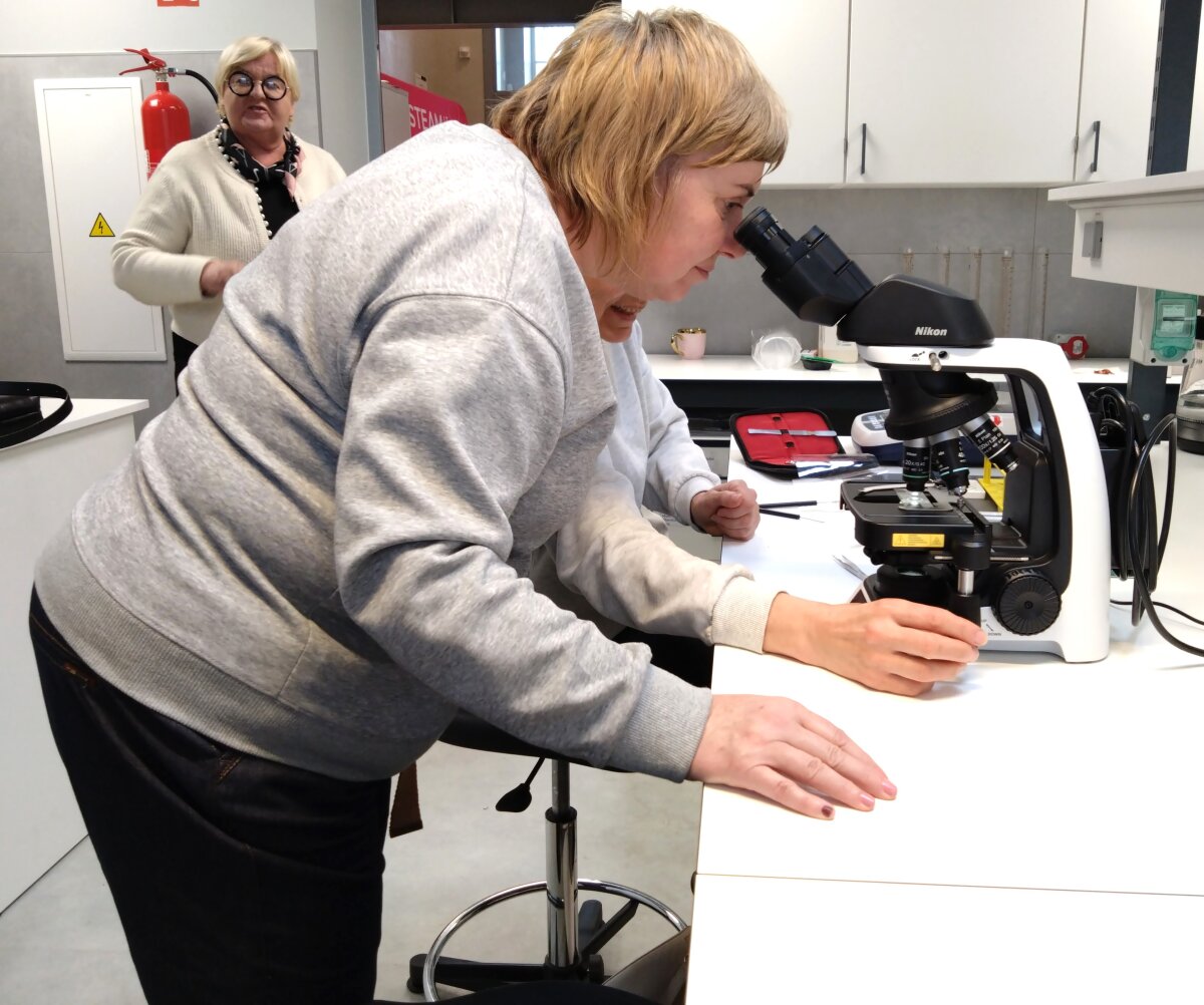 Pirmą stažuotės dieną Telšiuose aplankėme dvi mokyklas, jose domėjomės, kokios STEAM ugdymo galimybės bendradarbiaujant su STEAM centrais ir verslo institucijomis. Pirmiausia atvykome į Telšių Kranto progimnaziją, kur bendravome su biologijos mokytoja Julija Barsiene.